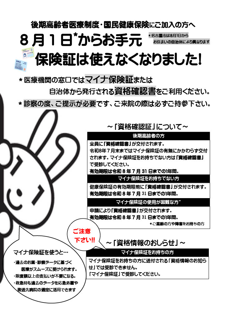 8月1日からは「マイナ保険証」または市町村・国保組合等から発行される「資格確認証」の何れかで受診が可能です。