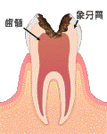 象牙質から更に深く進行し、とうとう「神経(歯髄)にまで及んでしまいました。ここまで進むと多くの場合、ひどい痛みに悩まされることになるでしょう。「神経(歯髄)」まで侵されていますので治療するには「神経(歯髄)」を取らなければなりません。